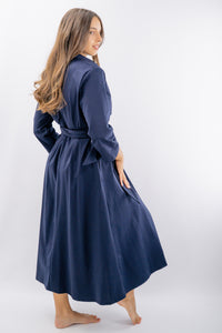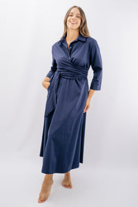 Linee fluide e carattere essenziale definiscono questo abito. Lo scollo a V con delicata abbottonatura valorizza il décolleté, mentre la cintura lunga da annodare modella il punto vita e permette styling versatili, anche con fiocco sul retro. La gonna ampia accompagna i movimenti e le maniche a tre quarti completano un look elegante e confortevole.