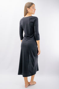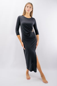 Abito lungo in texture elasticizzata dalla linea affusolata. È realizzato con manica al gomito, elegante drappeggio laterale con fibbia dorata ed ampio spacco sul davanti ad agevolare il movimento. Un capo versatile ed elegante in egual misura.