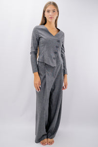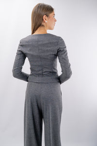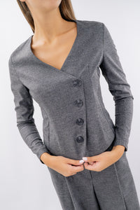 Blazer sfiancato in texture operata. L’abbottonatura diagonale valorizza il punto vita mentre l’orlo sagomato aggiunge carattere alla silhouette. Il tessuto compatto e confortevole accompagna i movimenti, rendendol un alleato versatile per look contemporanei. Asciutta la vestibilità con varietà di taglie. Raggiunge il top in abbinamento al gilet ed al pantalone corrispondenti.