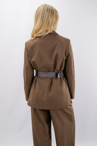 Blazer foderato, realizzato in texture consistente, con punto vita evidenziato da cintura a fibbia squadrata. Si presenta con revers classici, passanti e pattine frontali per il massimo dell'eleganza mentre il foulard aggiunge un tocco ricercato, perfetto sia annodato al collo che come dettaglio. Ideale abbinato al pantalone corrispondente per un total look casual chic. Vestibilità regolare con varietà di taglie.