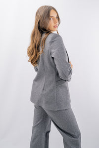 Silhouette sartoriale e comfort contemporaneo si incontrano in questo blazer doppiopetto. Il tessuto compatto e leggermente elasticizzato accompagna i movimenti e mantiene la linea pulita. I revers definiti e i bottoni lucidi ne valorizzano l’eleganza, perfetto se abbinato al pantalone completo.