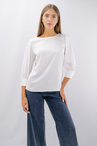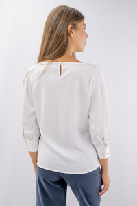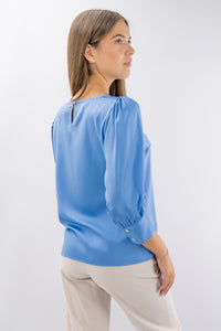 Blusa ad effetto satinato realizzata con manica al gomito con polsino chiuso da bottoni. È realizzata con spalla leggermente arricciata e manica a giro. La vestibilità è regolare con varietà di taglie e di colori. Ideale come sotto giacca per outfit easy-chic.