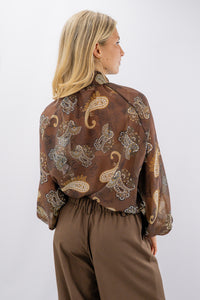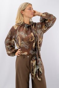 Blusa in fantasia paisley all over. Leggera e raffinata, grazie al tessuto semitrasparente, presenta polsini elasticizzati per il massimo comfort mentre il motivo paisley ed il fiocco al collo donano raffinatezza al capo. Perfetta per outfit quotidiani ed eleganti. Vestibiilità regular con varietà di taglie.