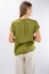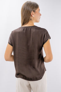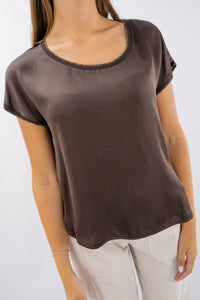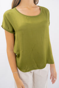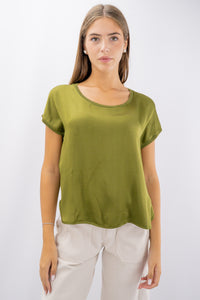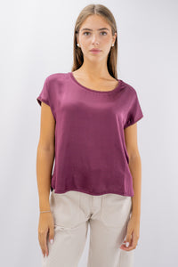 Blusa in pura viscosa ad effetto satinato realizzata con ampio scollo tondo e manica scesa corta bordai con lurex. La linea è dritta con vestibilità fluida e fondo stondato lateralmente. Perfetta sia come sotto giacca, sia come capo essenziale da attacco stagione. Disponibile in varie taglie e colori.