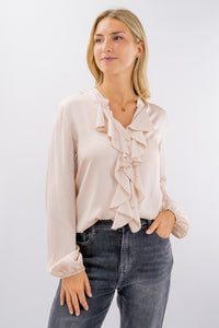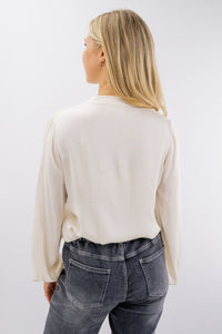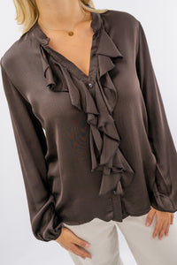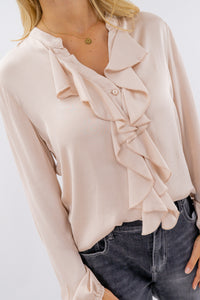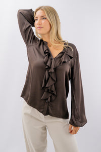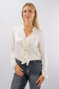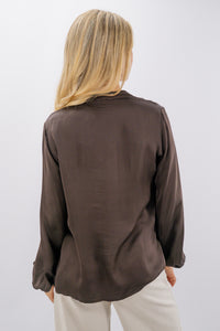 Camicia in pura viscosa satinata realizzata con rouches sul davanti. La scollatura è alla coreana con apertura a V. La manica è chiusa da polsino ad elastico.
