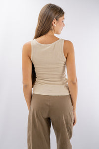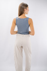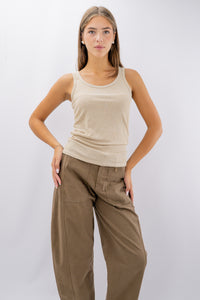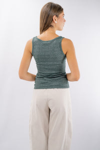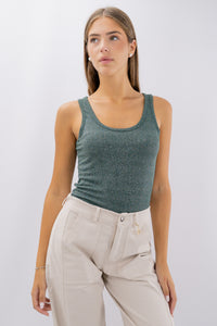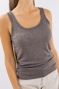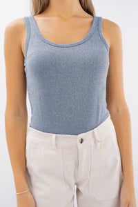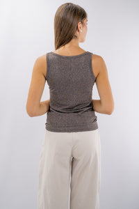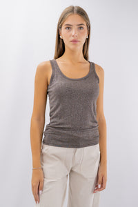 Canotta a costine in lurex in morbido misto viscosa elasticizzato realizzata con scollo ampio e vestibilità asciutta. Ideale come sotto giacca per outfit grintosi. Disponibile in vari colori.