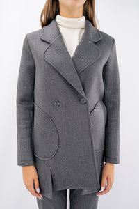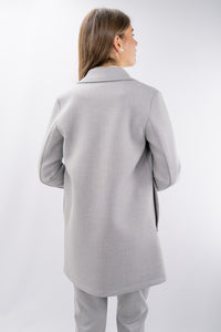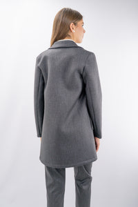 Linee pulite e consistenza contemporanea definiscono questo cappotto dalla lunghezza midi in neoprene lavorato a spina di pesce. È realizzato con chiusura a doppiopetto, revers ampi e spacchi frontali. Si completa di originali tasche a marsupio. Regolare la vestibilità con varietà di taglie. Si completa con il pantalone corrispondente.