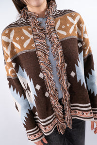 Cardigan aperto sciallato in texture consistente realizzato in fantasia etnica con frange a contorno della lista. La manica è con spalla scesa e la linea è dritta con vestibilità regolare. Un capo originale e d'effetto unito al calore del filato.