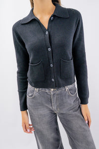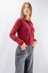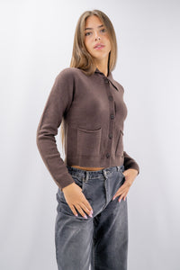Cardigan cropped realizzato in mobida viscosa. Presenta colletto sportivo, bordi a costine, tasche frontali e chiusura a bottoni per il massimo comfort. Un capo dallo stile casual perfetto abbinato ai pantaloni o gonna del tessuto e colore corrispondente. Vestibilità slim con varietà di colori e taglie.