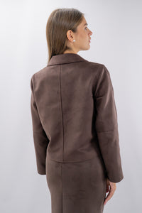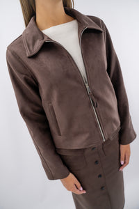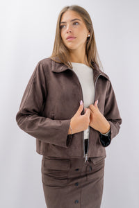 Un’interpretazione contemporanea della biker essenziale e morbida al tatto. La texture effetto scamosciato valorizza la silhouette pulita e leggermente boxy mentre il colletto sportivo e la zip donano un carattere deciso e versatile. Perfetta per completare look quotidiani con un tocco urbano. Versatile nell'utilizzo grazie alla fodera. Si completa di tasche a filo. Si completa con la gonna corrispondente.