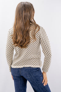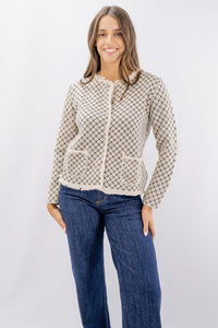 Giacchino modello coreana realizzato a motivo geometrico all over con lurex a donare raffinatezza all'insieme. Presenta le rifiniture in foto a tema sfrangiato, anche ad ornamento delle piccole taschine frontali. L'abbotonatura a gancetti rende il capo sfizioso nella sua essenza. Regolare la vestibilità con varietà di taglie