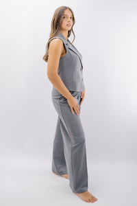 Gilet dal taglio sartoriale realizzato con revers e taschine a filetto. Si completa di martingala posteriore regolabile. Buona la vestibilità con varietà di taglie e colori. Si completa con il pantalone a palazzo corrispondente per outfit grintosi di carattere.