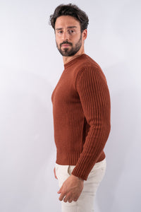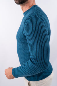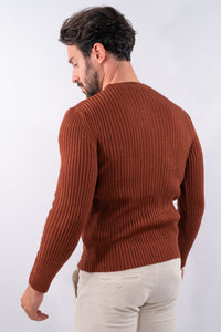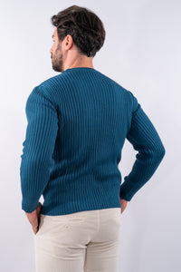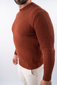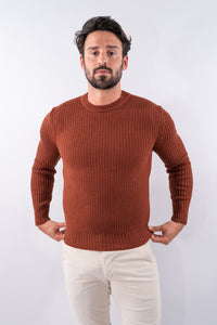 Maglia girocollo lavorata in misto lana. Realizzata con maniche e schiena a coste mentre il busto ha la lavorazione operata tono su tono che valorizza il capo con uno stile ricercato ma informale. Vestibilità asciutta con sviluppo taglia.