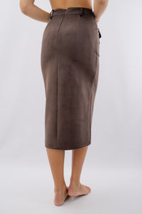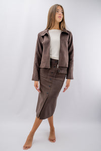 Eleganza quotidiana e carattere utility si incontrano in una gonna dalla linea dritta che valorizza la silhouette. La texture morbida effetto scamosciato dona un tocco sofisticato, mentre l'abbottonatura frontale dona un tocco pratico con l'ausilio dello spacco. Le tasche con patta aggiungono funzionalità, e la leggera elasticità del tessuto assicura comfort per tutto il giorno. Si completa con il giacchino corrispondente per un outfit sporty-chic.
