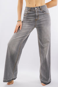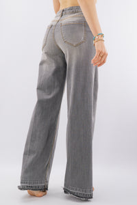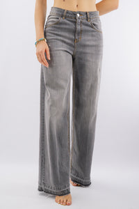 Jeans dalle linee ampie e contemporanee che ridefiniscono il classico denim in questo modello palazzo. La gamba fluida cade morbida fino al fondo a taglio vivo e sfrangiato, dona un carattere deciso e informale. Il lavaggio delicatamente vissuto valorizza la struttura del capo. Un alleato versatile per look casual o più ricercati.