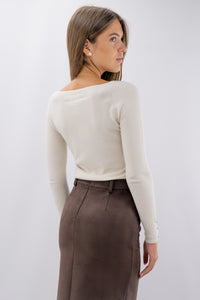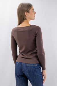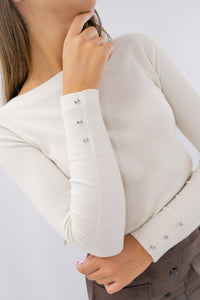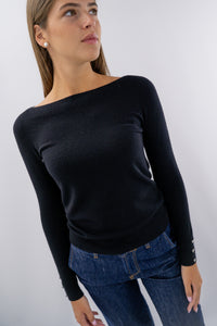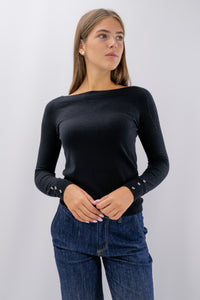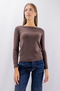 Maglia con scollo a barchetta realizzata a capo completo in morbida viscosa. Un capo elegante e raffinato grazie ai fiocchetti a dettaglio sui polsini. Presenta eleganti bordi a costine e scollatura a barchetta che valorizza le spalle. Perfetta abbinata al cardigan e pantalone/gonna corrispondente per look casual e raffinati. Vestibilità slim con varietà di colori e taglie.