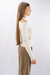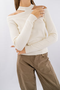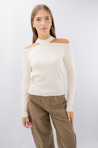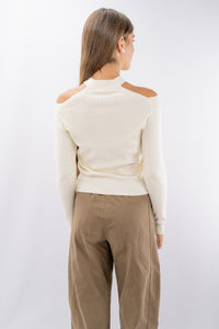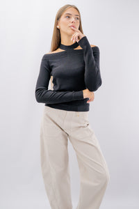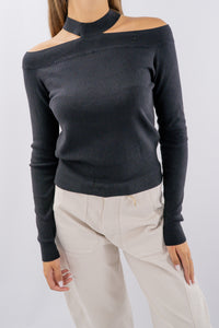 Linee essenziali definiscono questa maglia cut-out. La fascetta al collo crea un effetto choker e valorizza la scollatura, mentre le spalle scoperte donano un’attitudine moderna. La texture morbida in calda viscosa conferisce confort al capo. Si completa di manica a raglan, polsi a costine sottili ed abbassamento alto a coste . Per outfit semplici ma mai banali.