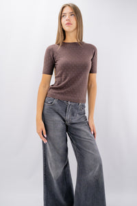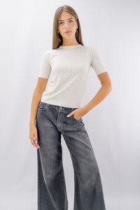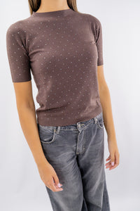 Maglia girocollo a manica corta realizzata a capo completo in morbida viscosa. Un capo moderno ed elegante impreziosito da raffinati brillantini all over. Presenta collo, polsini e fondo a costine. Perfetta come sottogiacca o abbinata al pantalone/gonna del tessuto corrispondente per creare total block raffinatissimi. Vestibilità slim con varietà di taglie e colori.