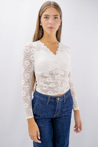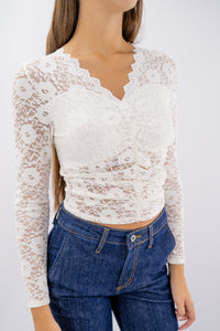 Romantica e contemporanea, questa maglia in pizzo valorizza la figura con scollo a V ricamato e linea aderente. Le maniche in pizzo creano un delicato gioco di trasparenze, mentre il davanti leggermente arricciato con taglio sotto-seno disegna elegantemente il busto. Un capo versatile, perfetto dal giorno alla sera.