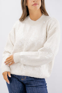 Un maglioncino avvolgente con motivo di paillettes applicate in modo random e di diverse dimensioni decora la maglia, donando carattere a un capo essenziale. Il taglio scatoletta con spalla leggermente abbassata e la lavorazione a costine su polsini e collo esaltano uno stile contemporaneo dal fascino brillante.