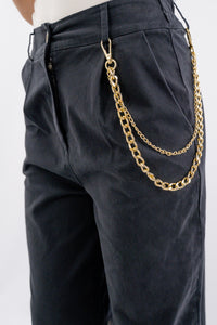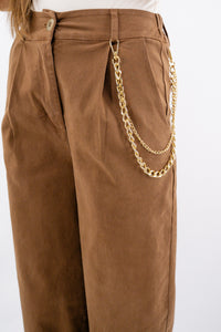 Pantalone a vita alta simil ovetto realizzato in cotone ed elastan. Presenta tasche alla francese ed elastico posteriore in vita per il massimo comfort. Le pinces valorizzano il capo mentre il tessuto leggermente stretch assicura libertà di movimento durante tutta la giornata. La catena applicata dona contemporaneità e lucentezza al capo, perfetto per look versatili e casual. Vestibilità regular con varietà di taglie.