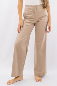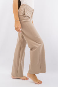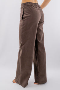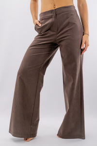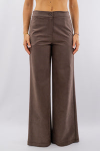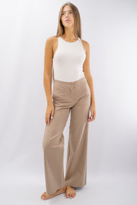 Pantalone palazzo realizzato con chiusura frontale a zip e bottone e cinturino elasticizzato posteriormente. La tasca è a filo e la gamba scende morbida. Si completa con il blazer corrispondente.