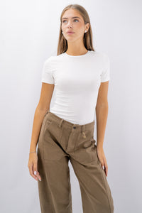 Design essenziale e comfort avvolgente si incontrano in una T‑shirt dalla mano morbida in cotone e viscosa elasticizzata. La finitura pulita e la silhouette asciutta la rendono un capo base versatile, perfetto sia da solo, sia come sotto giacche e cardigan.
