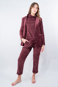 Un blazer dal design minimal sfoderato in ciniglia tessuto effeto velluto rasato realizzato con chiusura un bottone linea leggermente sciancrata e tasche decorative. Un capo confortevole di carattere, che si distingue per la texture raffinata e morbida, perfetto sia per look formali che per quelli più casual. Ideale abbinato al pantalone o alla casacca del tessuto corrispondente. Disponibile in varie taglie e colori.