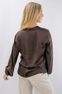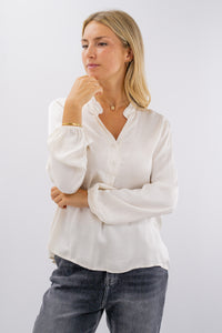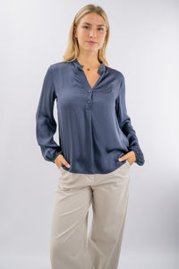 Blusa a manica lunga con colletto alla coreana realizzata in pura viscosa ad effetto satinato. Presenta polsini elasticizzati e scollo a V con due bottoncini che ne esaltano la femminilità. La parte posteriore è leggermente più lunga con fondo stondato. Vestibilità morbida con varietà di taglie.