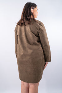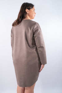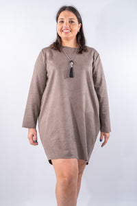 Linee essenziali a taglio vivo nei bordi e collo e texture morbida effetto scamosciato definiscono questo abito dal carattere raffinato. La modellatura dritta leggermente ovetto con girocollo e maniche lunghe valorizza uno stile pulito e versatile, perfetto da indossare con stivali o utilizzato come casacca lunga con legghins. La vestibilità confortevole con varietà di taglie e colori.