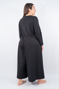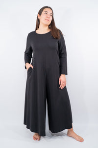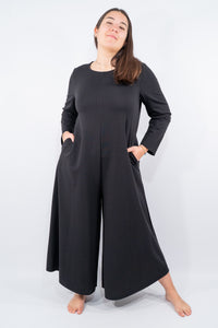Tuta oversize in punto Milano realizzata con gamba molto ampia, tasche laterali a scomparsa e chiusura posteriore a zip lunga. La linea rilassata è un valore aggiunto per questo capo versatile nell' utilizzo. Disponibile in vari colori.