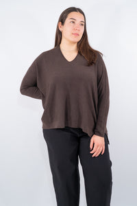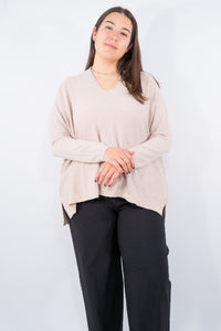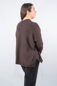 Una maglia raffinata dal taglio morbido e spacchi laterali, realizzata a capo completo e valorizzata da uno scollo a vi che aggiunge un tocco di eleganza discreta. Il design oversize e la linea fluida garantiscono comfort senza rinunciare allo stile, ideale per completare look casual o più sofisticati. Disponibile in più colori.