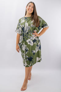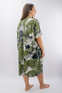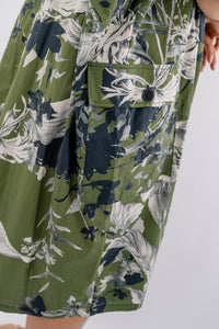 Abito oversize dalla linea ad ovetto con lunghezza midi in puro cotone con stampa floreale all over. È realizzato con collo ampio, spalla scesa e manica con risvolto. Presenta un originale tascone laterale con pattina a creare movimento. Ampia la vestibilità.