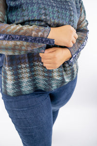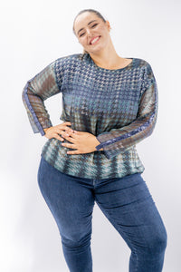 Blusa oversize realizzata con parte anteriore in voile doppiato con fantasia pied de poule, e parte posteriore in morbida maglia elasticizzata. Particolari le maniche con dettaglio di paillettes. Buona la vestibilità con varietà di taglie.