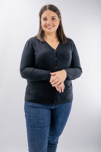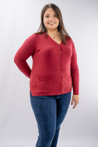 Cardigan con scollo a V in texture morbida con viscosa e cashmere. Presenta tasche applicate e spacchetti laterali che rendono il capo versatile e confortevole. Ideale per look informali e rilassati. Vestibilità over con varietà di colori.