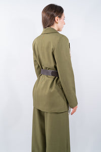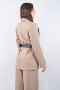 Blazer foderato, realizzato in texture consistente, con punto vita evidenziato da cintura a fibbia squadrata. Si presenta con revers classici, passanti e pattine frontali per il massimo dell'eleganza mentre il foulard aggiunge un tocco ricercato, perfetto sia annodato al collo che come dettaglio. Ideale abbinato al pantalone corrispondente per un total look casual chic. Vestibilità regolare con varietà di taglie.