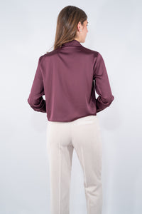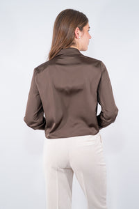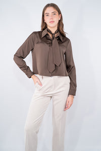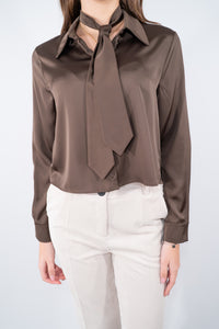 Camicia in texture effetto raso realizzata con collo sportivo e cravatta annessa. Presenta linea cropped morbida con vestibilità regolare e varietà di taglie e colori. Un capo chic di carattere