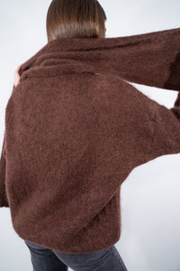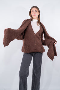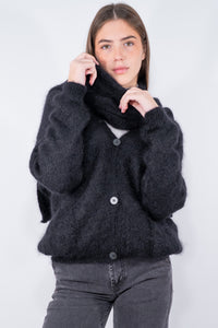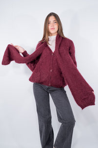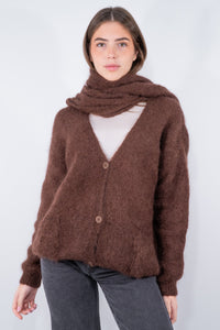 Cardigan in caldo super kid mohair con sciarpa annessa. È realizzato con scollatura a V e tasche frontali. Polsi ed abbassamento sono a costine sottili. Originale l'utilizzo con la sciarpa per outfit di carattere per le giornate più fredde. Disponibile in vari colori.