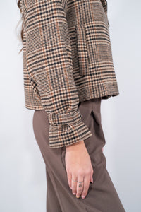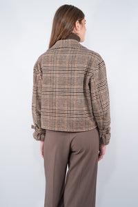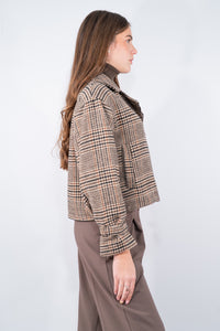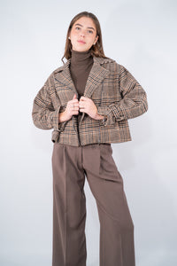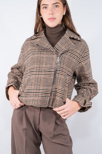 Giacca Biker in caldo tessuto con zip laterale e collo reverse, tasca a filo, con il particolare laccio regolabile sul polso. Un'interpretazione sofisticata dello stile biker, arricchita da una texture check di ispirazione classica. La silhouette cropped e la struttura dal taglio deciso uniscono praticità e carattere, regalando un tocco grintoso ai look quotidiani. Perfetta per donare una nota di personalità agli abbinamenti più essenziali.