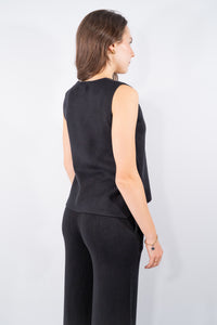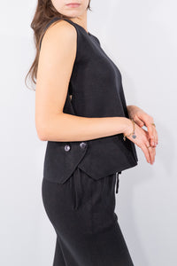Design minimal e dettagli funzionali caratterizzano questo gilet in maglia, perfetto per aggiungere un tocco contemporaneo al guardaroba quotidiano. La linea essenziale esalta la praticità del capo, mentre i bottoni laterali donano un effetto dinamico e valorizzano la silhouette rendendo il gilet ideale per sovrapposizioni moderne e versatili. Perfetto abbinato al pantalone e coprispalle della stessa texture. Vestibilità asciutta.