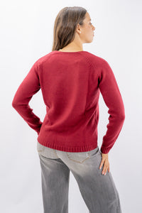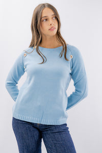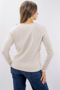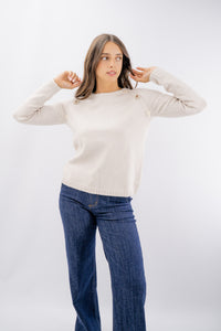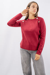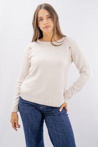 Maglia girocollo con ricciolo in texture morbida con viscosa e cashmere. Il design essenziale viene impreziosito da delicati bottoni decorativi sul giro manica a raglan caratterizzato da motivo a punto giorno. Si completa di polsini ed abbassamento a coste morbide. Regolare la vestibilità.