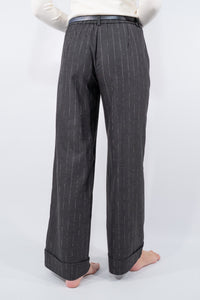 Eleganza senza tempo e comfort si incontrano in questo pantalone palazzo dalla sofisticata lavorazione gessata. La linea ampia e fluida slancia la figura, realizzato con elatico in vita per un maggior confort mentre il risvolto al fondo aggiunge un raffinato dettaglio sartoriale. Un capo ideale per look formali e versatili, perfetto per essere indossato sia in ufficio che nelle occasioni speciali.