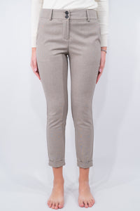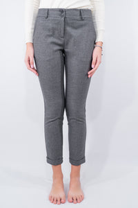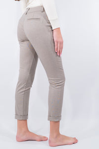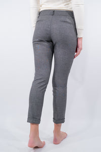 Un pantalone dalla silhouette elegante, con risvolto alla caviglia che ne accentua la linea. Il tessuto mano lana fiammato conferisce un tocco di raffinatezza, tasca alla francese e i dettagli in vita, con zip, bottoni e cuciture precise, evidenziano la lavorazione sartoriale. Un capo versatile per un look autunnale sofisticato. Ideale abbinarlo alla blusa e gilet corrispondente. Vestibilità ascitta con sviluppo taglie.