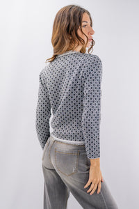 Giacchino modello coreana realizzato a motivo geometrico all over con lurex a donare raffinatezza all'insieme. Presenta le rifiniture in foto a tema sfrangiato, anche ad ornamento delle piccole taschine frontali. L'abbotonatura a gancetti rende il capo sfizioso nella sua essenza. Regolare la vestibilità con varietà di taglie