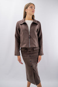 Eleganza quotidiana e carattere utility si incontrano in una gonna dalla linea dritta che valorizza la silhouette. La texture morbida effetto scamosciato dona un tocco sofisticato, mentre l'abbottonatura frontale dona un tocco pratico con l'ausilio dello spacco. Le tasche con patta aggiungono funzionalità, e la leggera elasticità del tessuto assicura comfort per tutto il giorno. Si completa con il giacchino corrispondente per un outfit sporty-chic.