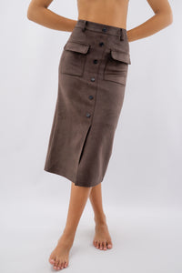 Gonna midi effetto suede con bottoni e tasche con patta