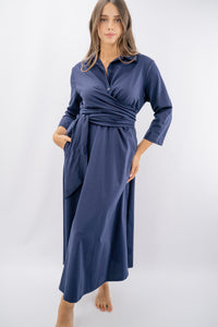 Linee fluide e carattere essenziale definiscono questo abito. Lo scollo a V con delicata abbottonatura valorizza il décolleté, mentre la cintura lunga da annodare modella il punto vita e permette styling versatili, anche con fiocco sul retro. La gonna ampia accompagna i movimenti e le maniche a tre quarti completano un look elegante e confortevole.