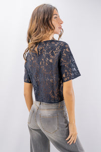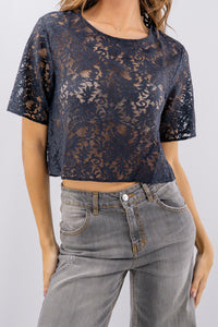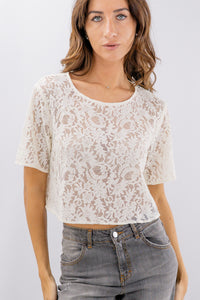 Blusa mezze maniche cropped in pizzo. Il gioco di trasparenze valorizza gli abbinamenti a strati, mentre il girocollo pulito e le maniche corte ne esaltano la versatilità per look dal carattere elegante ma disinvolto. Ideale da indossare sotto blazer o pantaloni e gonne a vita alta. Vestibilità asciutta.