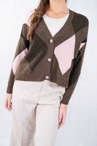 Un tricot grafico che aggiorna un classico del guardaroba. Il motivo a rombi oversize disegna la silhouette dal taglio morbido, mentre i bottoni gioiello illuminano la chiusura. Le finiture a coste e la mano soffice assicurano comfort quotidiano e stile disinvolto.