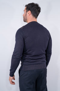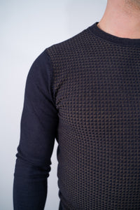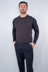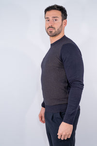 Maglia girocollo realizzata in misto cotone. Un capo dal design contemporaneo grazie alla particolare lavorazione bicolore sul davanti che aggiunge dinamicità e movimento. Impreziosita da costine su collo, polsini e fondo, ideale per abbinamenti sofisticati o per donare personalità ai look quotidiani. Vestibilità regular con varietà di taglie.